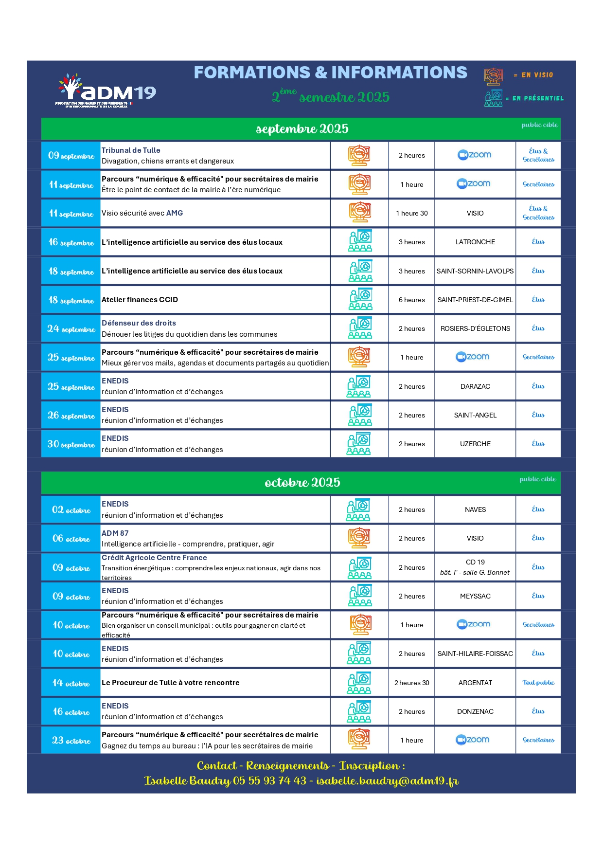 ✅ Des réunions d’information et de formation, en général gratuites, sur des thématiques variées en lien avec l’administration communale. Elles sont souvent organisées avec des structures partenaires (ex. : Finances publiques, Archives départementales, Gendarmerie nationale, ENEDIS…).